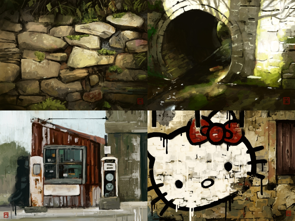 As a test, give yourself 2 minutes to come up with as many cool ideas as you can imagine involving things like windows, fences, grates... anything with holes in it. How about multi-layered explosions with bits of shrapnel blurred out in the foreground (I may finally find a few overt uses for the soft brush in my general painting approach), or tunnel-like paintings with an added sense of depth. How might you explore notions like a sense of height?